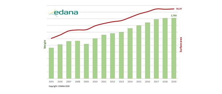 According to figures collected and compiled by the EDANA secretariat, production of nonwovens in Europe reached 2,782,917 tonnes. This compares with 2,774,194 tonnes in 2018 when the annual growth was 1.5%. Despite these two low growth years, the European production recorded an average growth rate of 4.4% over the last decade.