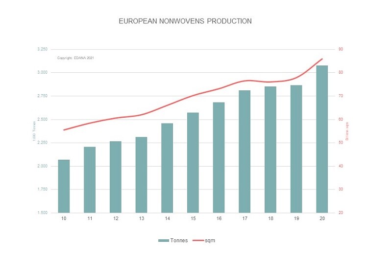 European nonwoven production grows by over 7% to exceed 3 million tonnes in 2020