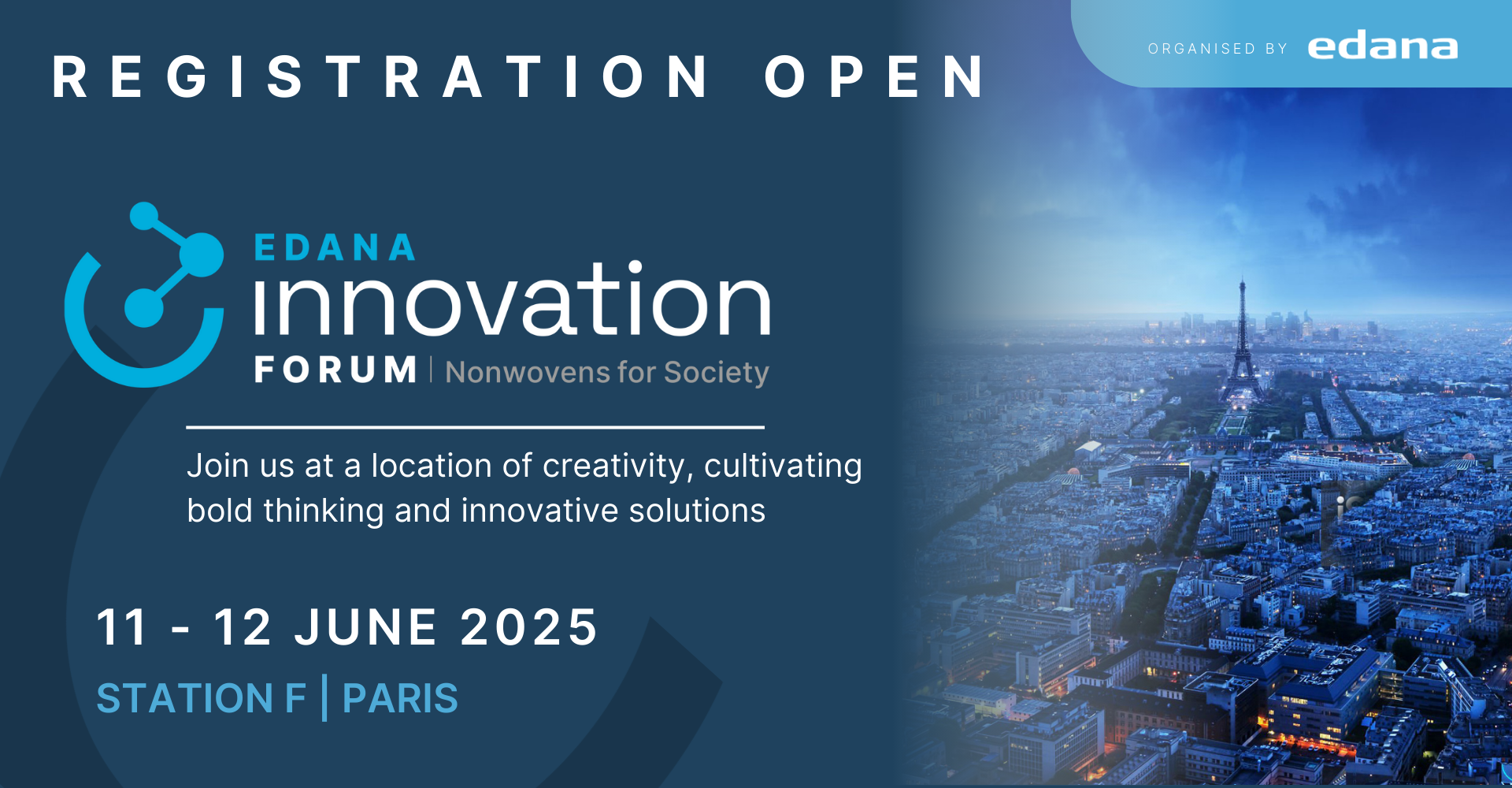 Brussels, 12th of February 2025 - The wait is over! EDANA Innovation Forum 2025 is officially open for registration, inviting pioneers from across the nonwovens industry to gather at Station F, Paris, on June 11-12, 2025. Designed as a hub for bold ideas, breakthrough technologies, and fresh perspectives, this event promises an inspiring mix of keynote sessions, interactive discussions, and innovative ideas.