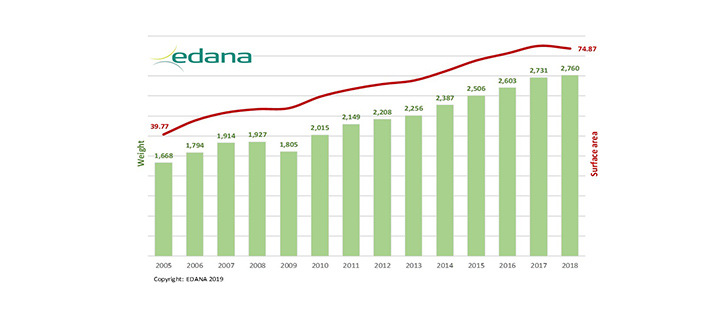 According to figures collected and compiled by EDANA, the overall production of nonwovens in Europe grew by around 1.3% in 2018 to reach 2,760,000 tonnes. Over the last decade, the annual average growth rate has been nearly 4%.