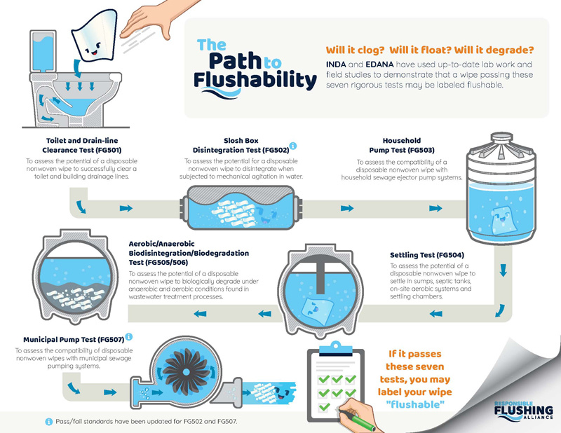 “This update enhances the Guidelines for flushable products to ensure continued compatibility with wastewater infrastructure,” said Dave Rousse, President of INDA. The Guidelines include seven flushability assessment tests related to performance in pipes, pumps, and both household septic systems and municipal wastewater treatment systems. Products may only be labelled “flushable” if they meet the demands of all seven tests.